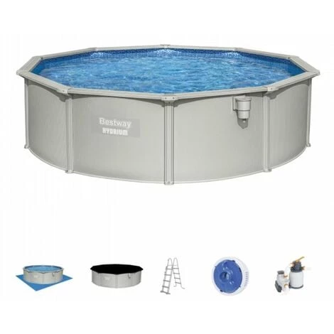 Kit piscine hors-sol Bestway acier HYDRIUM STEEL WALL POOLS grise ronde 460cm x 120 cm. Kit piscine livré avec groupe de filtration à sable, échelle, tapis de sol. Parois acier.