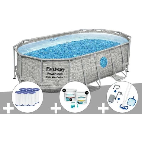 Kit Piscine Tubulaire Ovale Bestway Power Steel SwimVista Avec Hublots 4,27 X 2,50 X 1,00 M + 6 Cartouches De Filtration + Kit De Traitement Au Chlore + Kit D’entretien Deluxe