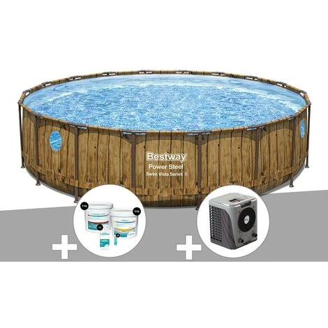 Kit Piscine Tubulaire Ronde Bestway Power Steel Avec Hublots 5,49 X 1,22 M + Kit De Traitement Au Chlore + Pompe à Chaleur