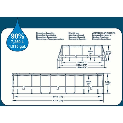 – Contenu : 1 piscine, 1 filtre à cartouche, 1 échelle, 1 couverture, 1 distributeur de chlore et 1 patch de réparation.