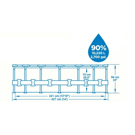 Ce modèle comprend un épurateur à cartouche de 2.006 litres/heure afin que l’eau de la piscine soit toujours propre. Grâce à la vanne de vidange, il peut être vidé rapidement. Il a une capacité de 10.220 litres et des dimensions de 427 x 84 cm.