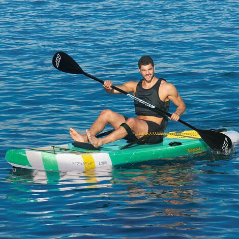 Nos kits complets comprennent tous les éléments nécessaires pour que vous puissiez pratiquer le paddle surf sans avoir besoin d’aucun autre élément supplémentaire. De plus, tout est construit pour que vous n’ayez à vous soucier que des vagues et des eaux agitées et non de la résistance de la planche et de votre sécurité. La planche de paddle surf gonflable Hydro-Force Freesoul Tech Bestway contient : une planche de paddle surf, une pompe à main, un sac à dos de luxe, une corde de sécurité, un siège, un repose-pieds, un kit de réparation. Le Freesoul Tech est livré dans un sac à dos de luxe que vous pouvez facilement transporter de votre véhicule à l’eau ! Une fois que vous êtes prêt à utiliser votre SUP, il suffit de le gonfler avec la pompe à main incluse et vous êtes prêt pour une journée extraordinaire sur l’eau. Vous pouvez même emmener votre pratique de yoga dans l’eau, car le coussin de traction antidérapant vous aidera à garder votre équilibre lorsque vous prendrez une pose. Le Freesoul Tech dispose d’une dérive amovible pour la planche à voile. Le matériau du point de chute doit ses extraordinaires propriétés d’extrême rigidité combinées à une étonnante légèreté à un filet de milliers de fils de polyester, créant un panneau solide qui peut supporter jusqu’à 160 kg. Le cordon élastique du SUP permet de ranger vos effets personnels pendant que vous êtes dans l’eau. Et lorsque vous avez terminé le SUP, la valve d’air vous permet de dégonfler rapidement la planche en peu de temps. Il suffit de rouler votre planche de surf à pagaies Hydro-Force Freesoul Tech Bestway, de la ranger dans votre sac à dos et de partir. Caractéristiques : – Fabriqué à partir de Tritech (un matériau renforcé à trois couches avec un noyau en maille de polyester enfermé entre deux couches de PVC épais) et le matériau Drop Stitch, pour assurer la solidité, la stabilité et la durabilité. – Le Drop Stitch permet à une planche de pagaie gonflable de conserver sa forme lorsqu’elle est gonflée à haute pression en joignant deux pièces de tissu de support en polyester tissé avec des milliers de fils de nylon fins. – Surface antidérapante. – Siège amovible avec dossier et repose-pieds. – Possibilité de connexion rapide à la plate-forme (base de mât non incluse). – Cordon élastique pour un stockage supplémentaire. – Poignées latérales pratiques pour faciliter le transport du SUP. – Planche amovible pour la planche à voile. – Catégorie : Touring. – Embarquez pour de longs voyages en toute sécurité sur l’eau, pour la voile, le yoga et le kayak grâce à sa stabilité, sa vitesse et son espace de chargement. – Contenu : 1 planche, 1 pagaie, 1 pompe à main, 1 sac à dos de luxe, 1 corde de sécurité, 1 siège, 1 repose-pieds, kit de réparation.