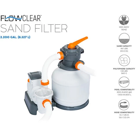 La pompe filtre Flowclear à sable Bestway 58499 est très pratique et simple à utiliser. Il vous suffira de la brancher au circuit de la piscine et dinsérer le sable pour le filtrage qui peut durer environ 5 ans.